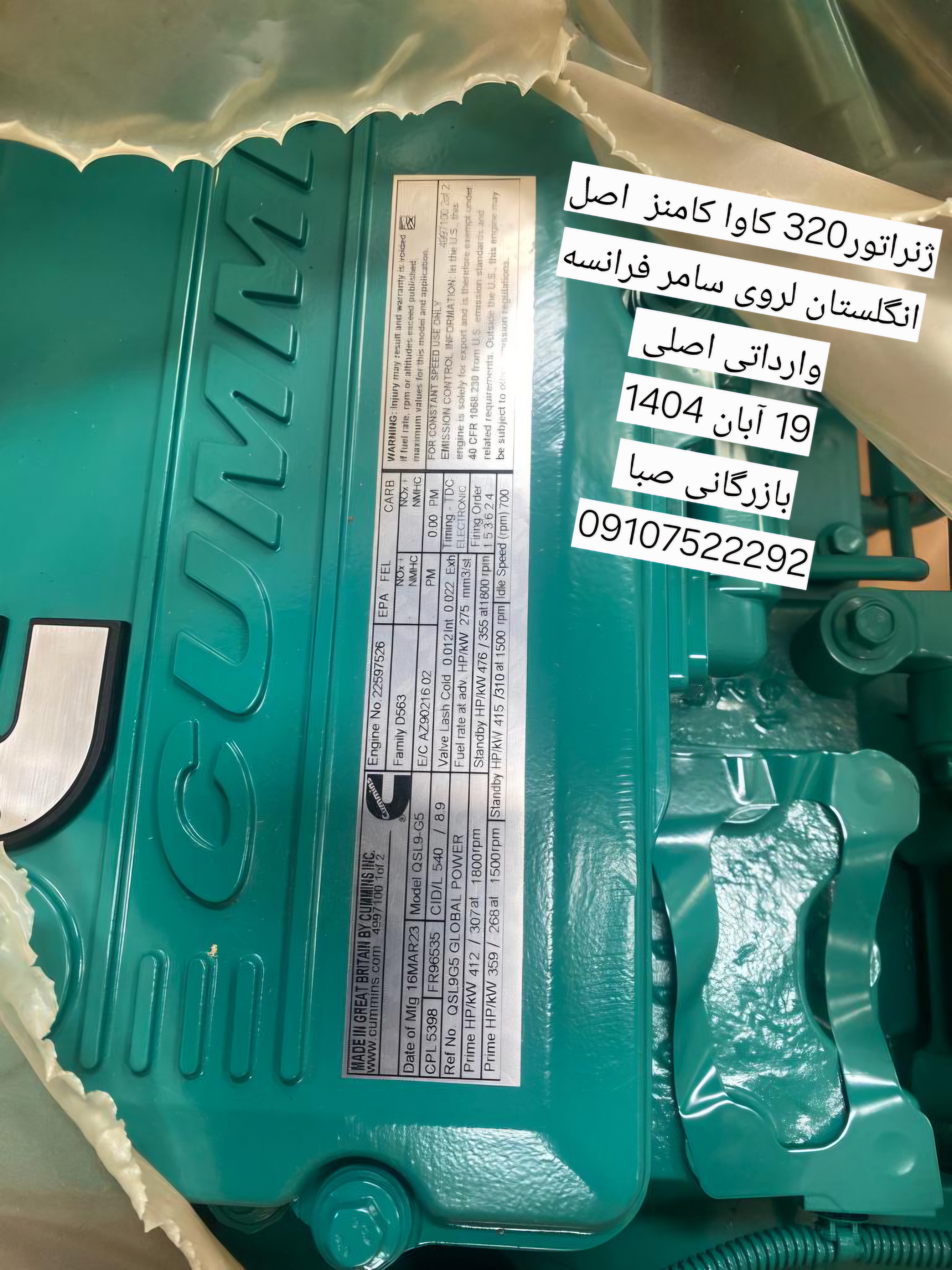 توان پرایم (کاوا) : 300kVAتوان اضطراری (کاوا) : 330kVAتوان پرایم : 240kWتوان اضطراری : 264kWبرند موتور : Cumminsمدل موتور : QSL9-G3کشور سازنده موتور : ,انگلیس,هندتوان موتور : 291hpحداکثر توان موتور : 327hpحجم موتور : 8.8Lتعداد سیلندر : 6سیستم تنفس : توربو شارژنوع گاورنر : الکترونیکیمصرف سوخت 100% : 59L/hبرند آلترناتور : Stamfordکشور سازنده آلترناتور : انگلیسمدل آلترناتور : HCI434D/444Dتوان اسمی آلترناتور : 315kVAتوان اضطراری آلترناتور : 346kVAفرکانس : 50Hzعایق : Hسیستم حفاظت : IP23بهره وری : 93.1%ضریب قدرت : 0.8تعداد بلبرینگ : 1ولتاژ خروجی : 400/230V
